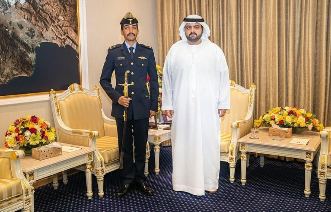 وقدم سموه التهنئة للزحمي على تفوقه ونيله سيف الشرف، من كلية خليفة بن زايد الجوية، متمنيا له التوفيق والنجاح وبذل المزيد من الجهود والمثابرة لأداء واجباته ومهامه العملية بكل كفاءة واقتدار إلى جانب إخوانه من حماة الوطن.