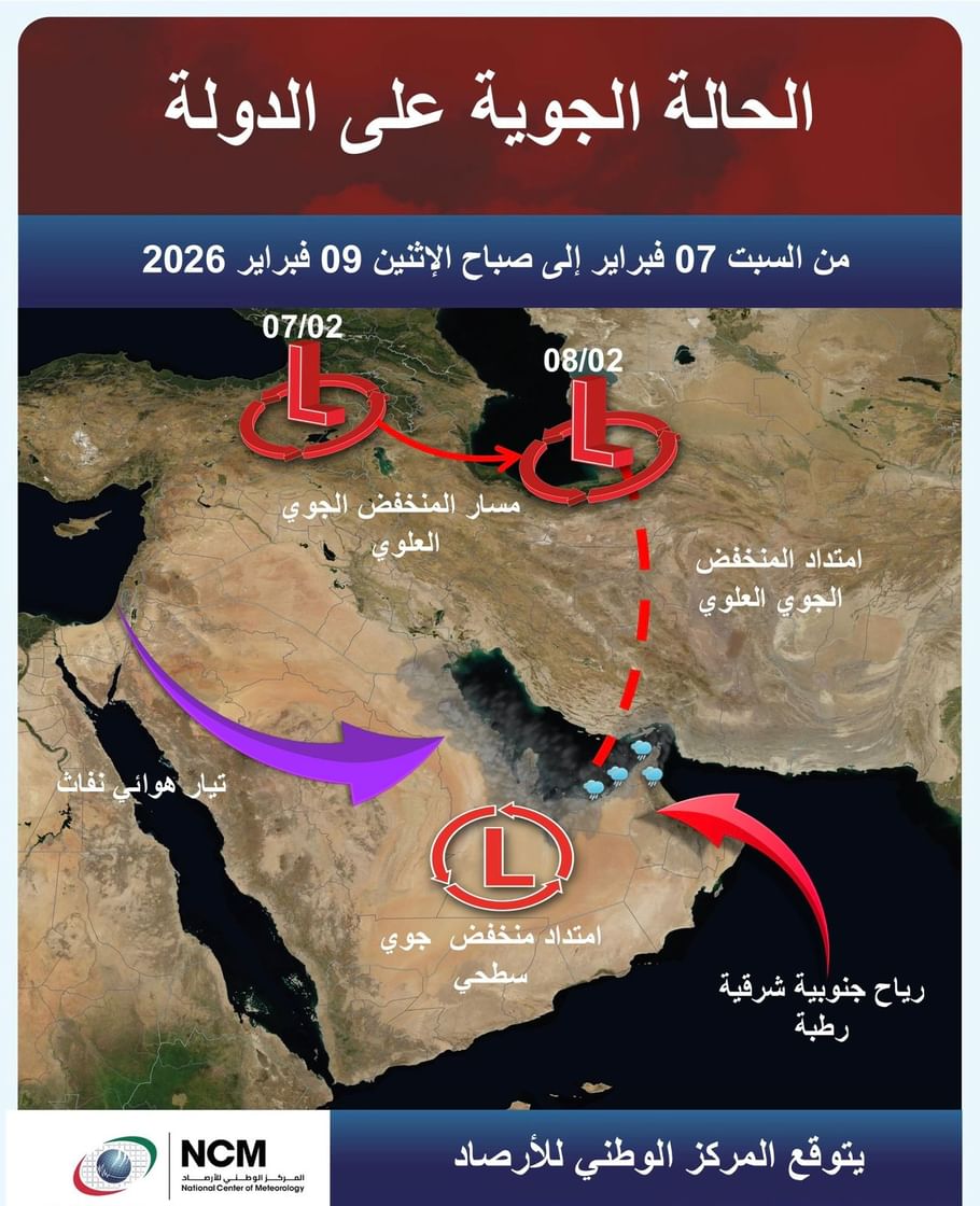 توقع المركز الوطني للأرصاد أن تشهد الدولة، اعتباراً من يوم غد وحتى صباح 9 فبراير المقبل، مرور منخفضات جوية علوية ضعيفة على فترات متباعدة، يصاحبها امتداد منخفضات جوية سطحية.